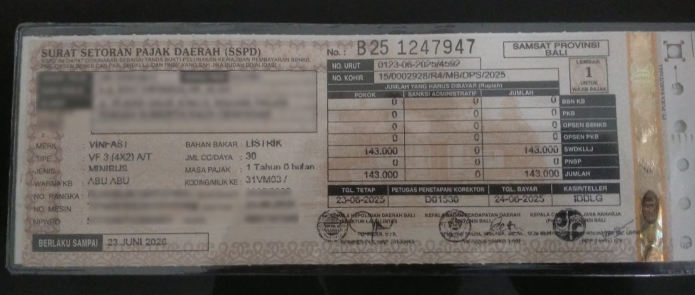 Dokumen pembayaran pajak yang menunjukkan angka fantastis ini berasal dari Samsat Provinsi Bali dengan tanggal penetapan 23 Juni 2025 dan tanggal bayar 24 Juni 2025. Tertera jelas pada kolom “JUMLAH YANG HARUS DIBAYAR”, PKB VinFast VF3 hanya Rp143.000, dengan total keseluruhan biaya yang sama karena tidak ada sanksi administratif dan biaya-biaya lainnya.